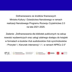 242 nowe tytuły trafiły do naszej biblioteki dzięki dofinansowaniu Ministra Kultury i Dziedzictwa Narodowego w ramach realizacji Narodowego Programu Rozwoju Czytelnictwa 2.0 na lata 2021-2025.