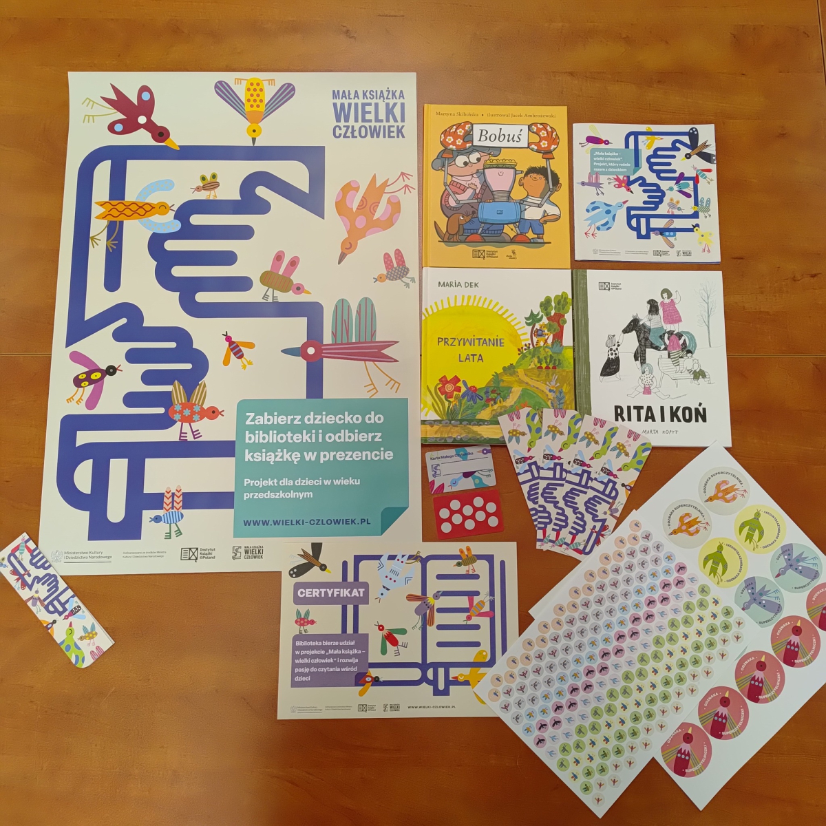-jedna książka spośród czterech tytułów (dostępne do wyczerpania zapasów): "Krasnal w krzywej czapce" autorstwa Wojciecha Widłaka z ilustracjami Aleksandry Krzanowskiej; „Rita i koń” – tekst i ilustracje Marta Kopyt, Wydawnictwo Muchomor; „Przywitanie Lata” – tekst i ilustracje Maria Dek, Wydawnictwo Bernardinum; „Bobuś” – tekst Martyna Skibińska, ilustracje Jacek Ambrożewski, Wydawnictwo Dwie Siostry.