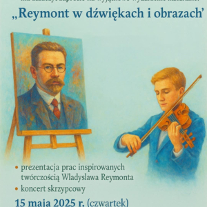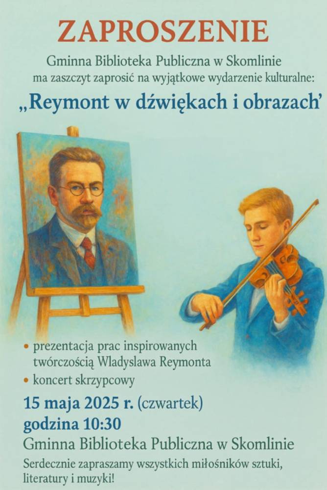 Serdecznie zapraszamy w najbliższy czwartek ( 15.05.2025) o godzinie 10.30 na wystawę oraz koncert skrzypcowy w wykonaniu pana Michała Jędryszka poświęcony twórczości Wł. Reymonta teren zielony obok Urzędu Gminy Skomlin.
